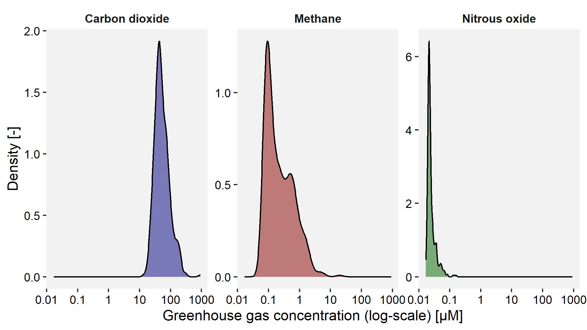 To start our exploration of the dissolved greenhouse gas data, we look at the distribution of the obtained values and how they relate to each other. More specifically, the derived density plots show us that the three considered gases display different ranges: carbon dioxide levels typically fall between 50 and 500 µM, while methane levels range from 0.05 to 5 µM and nitrous oxide levels range from 0.01 and 0.1 µM. In other words, one can expect carbon dioxide levels to be higher than methane levels, while nitrous oxide levels constitute the smallest fraction.