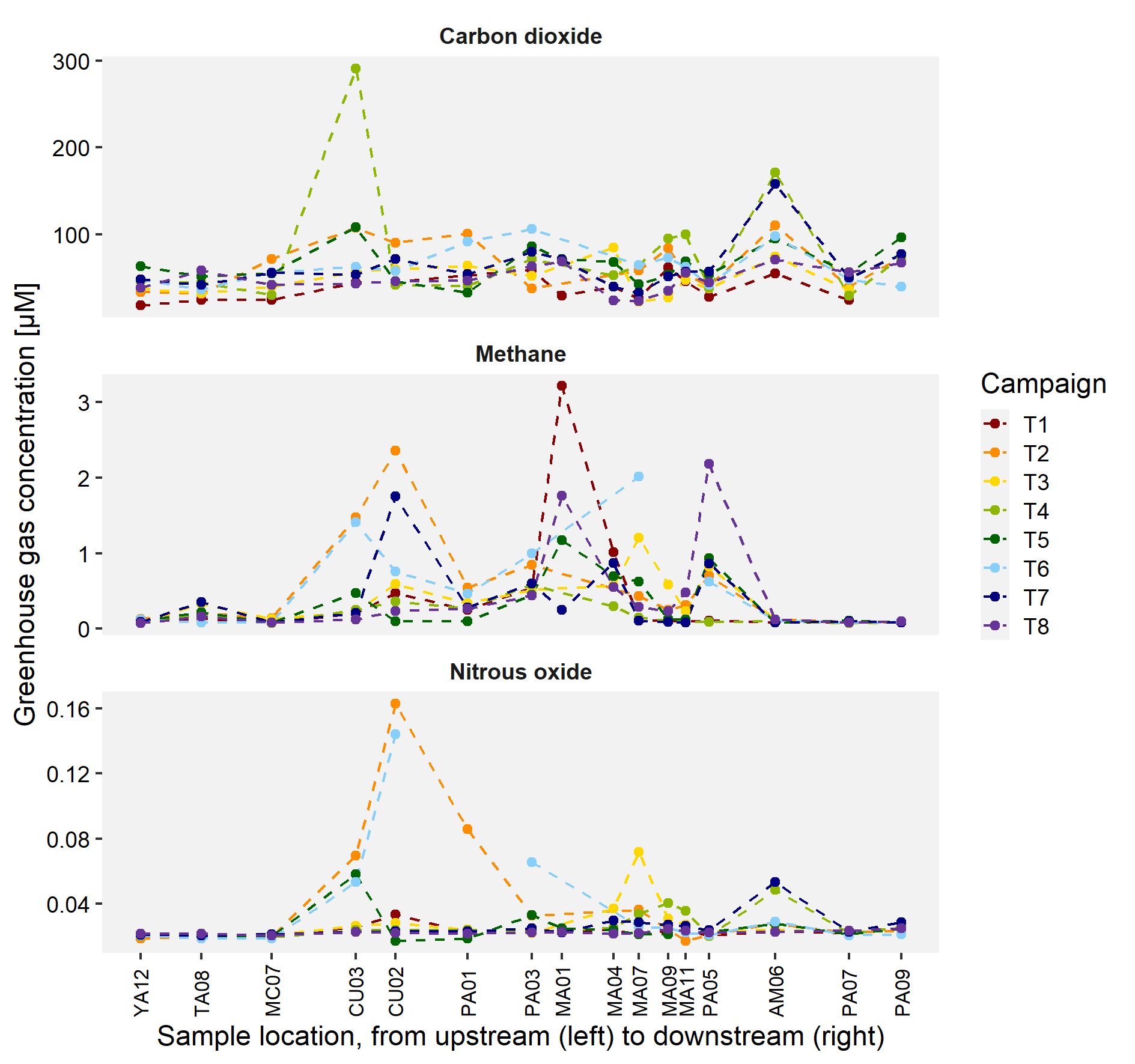 Aside from the temporal variability, we are also interested in the spatial variability and how greenhouse gas levels change throughout the sampled river system. Via a subset of sampling locations, the spatial variability is displayed and shows an increase in methane and nitrous oxide downstream of the city of Cuenca during the drought campaigns (2 and 6), as well as in the upstream part of the Mazar reservoir (methane in MA01, during wet periods) and within the Amaluza reservoir (nitrous oxide in AM06, during wet periods). Carbon dioxide remains relatively stable throughout the system and the different campaigns, except for some very specific moments. Over all, it can be said that mostly methane levels increase due to the presence of the city of Cuenca, while the presence of carbon dioxide remains more or less similar. Nitrous oxide seems to be especially affected directly downstream of the city during extended periods of drought.