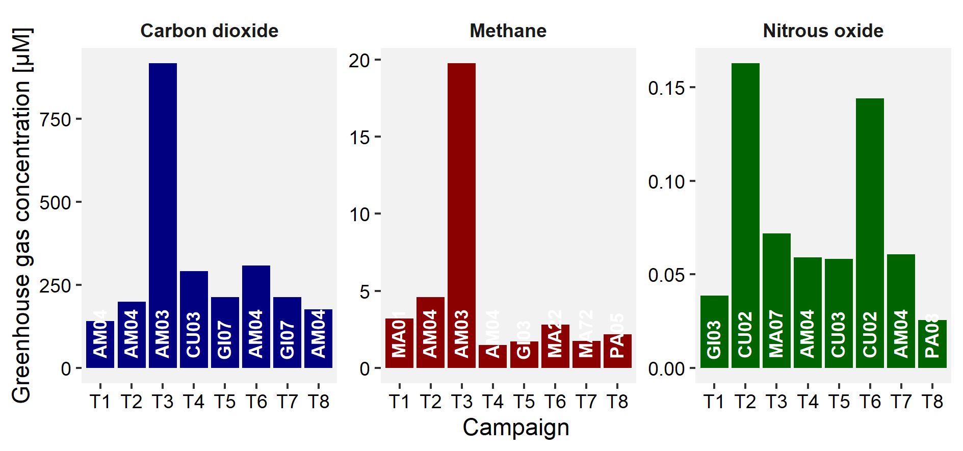 Lastly, all available data is compiled into a single average level of dissolved greenhouse gases per site to identify those sites that are, on average, the sites with the highest and lowest presence of dissolved greenhouse gases. From this, it is clear that site AM03 stands out from all other sites regarding carbon dioxide and methane levels, with site AM04 following at a distance. In contrast, nitrous oxide seems to be generally the highest in sites MA20 and CU02, as well as in site AM04. When we keep into account that site AM03 has only been sampled twice and that site MA20 has only been sampled once, it becomes clear that site AM04 can be considered as the location with the highest level of dissolved greenhouse gases (with the sidenote that also CU02 scores high for nitrous oxide). At the other end of the graph, the differences between sites are not as great and we get an overlap of various sites. These sites include locations in the Collay part of the reservoir (codes 'CO'), as well as other rather undisturbed sites (e.g., El Chorro (code 'EC'), El Labrado (code 'LA'), …). It should be noted that the depiction has been simplified by having only a subset of all sites, though the top and bottom three sites for each greenhouse gas are always included.