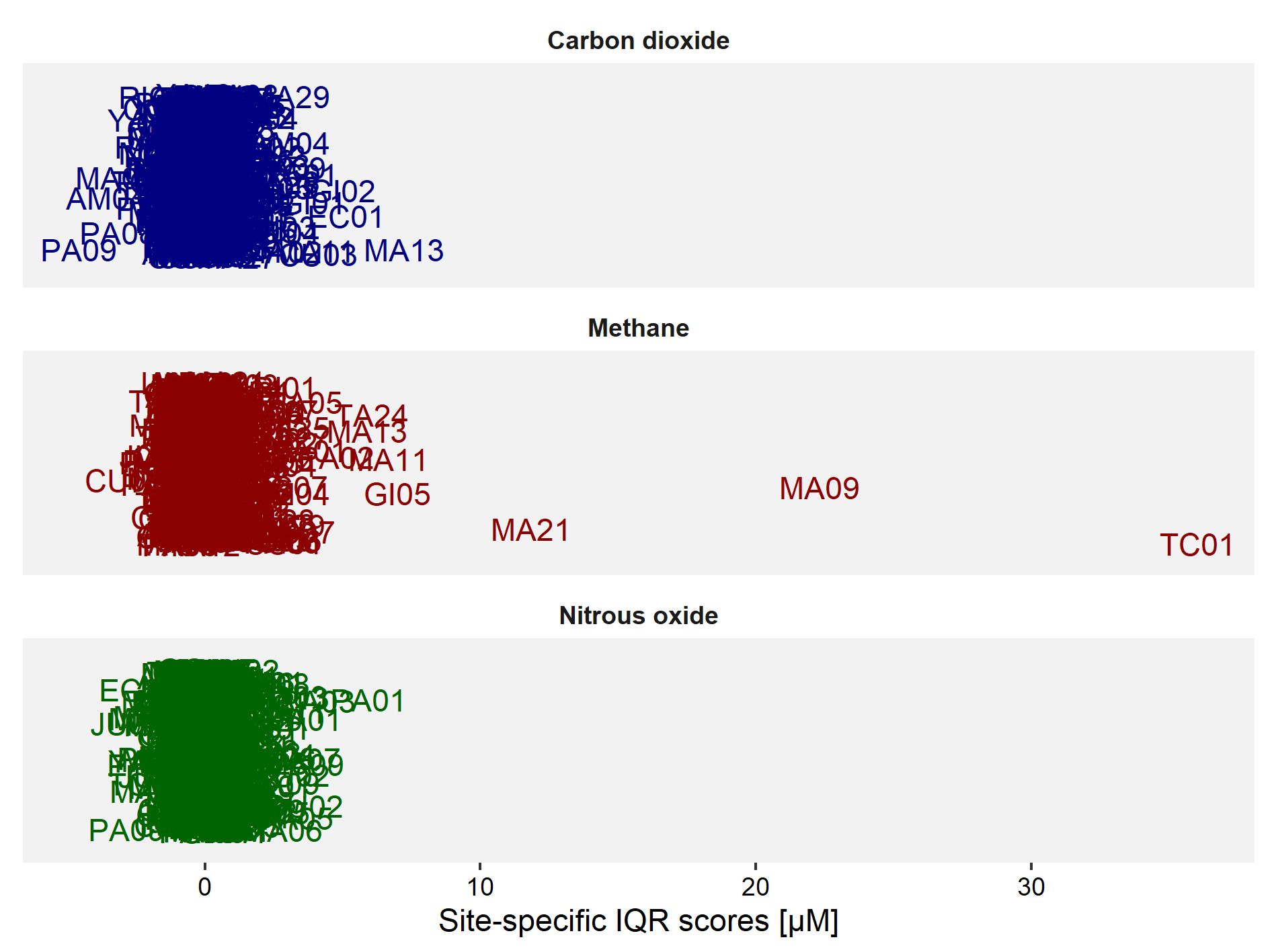 From the density plots, it can be observed that there might be some exceptionally high levels of dissolved greenhouse gases present in our database. A deeper look into the presence of potential outliers can provide an answer to this. In order to be able to compare the analyses for all three greenhouse gases, a site-specific factor is calculated that represents the distance of a value from the median value in terms of the inter-quartile range (IQR). More specifically, a subset is derived from the main data set for each combination of sampling site and greenhouse gas, over all campaigns (hence, resulting in a subset of maximally 8 observations). Then, the median of this subset of greenhouse gas values is subtracted from the subset of individual greenhouse gas values, followed by a division by the IQR for the same subset of greenhouse gas values. The resulting distance factor directly gives an idea of how far each individual observation is removed from the sample- and gas-specific median value. For instance, a site with a distance factor of 2 is situated at twice the IQR from the median in the positive direction.
