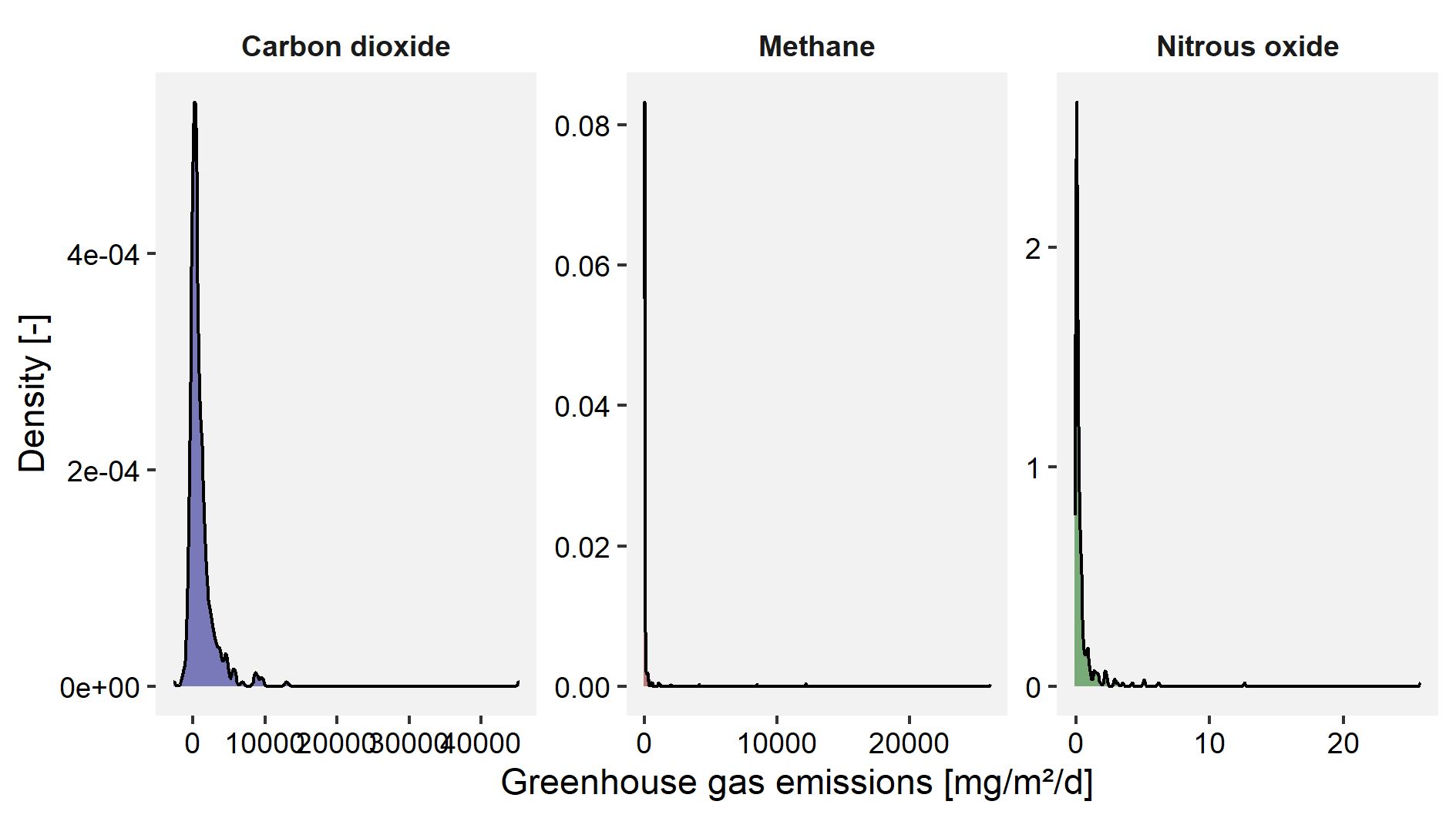 To start our exploration of the emitted greenhouse gas data, we look at the distribution of the calculated values and how they relate to each other. More specifically, the derived density plots show us that the three considered gases display overlapping ranges: carbon dioxide emissions cover the widest range and typically fall between -500 mg/m²/d and 800 mg/m²/d, while methane emissions range from 0 to 50 mg/m²/d and nitrous oxide levels range from 0 and 3 mg/m²/d. In other words, one can expect carbon dioxide emissions to be higher than methane levels, while nitrous oxide emissions constitute the smallest fraction. At the same time, the negative values that were obtained for the carbon dioxide emissions suggest that some sites can act as sinks rather than sources.