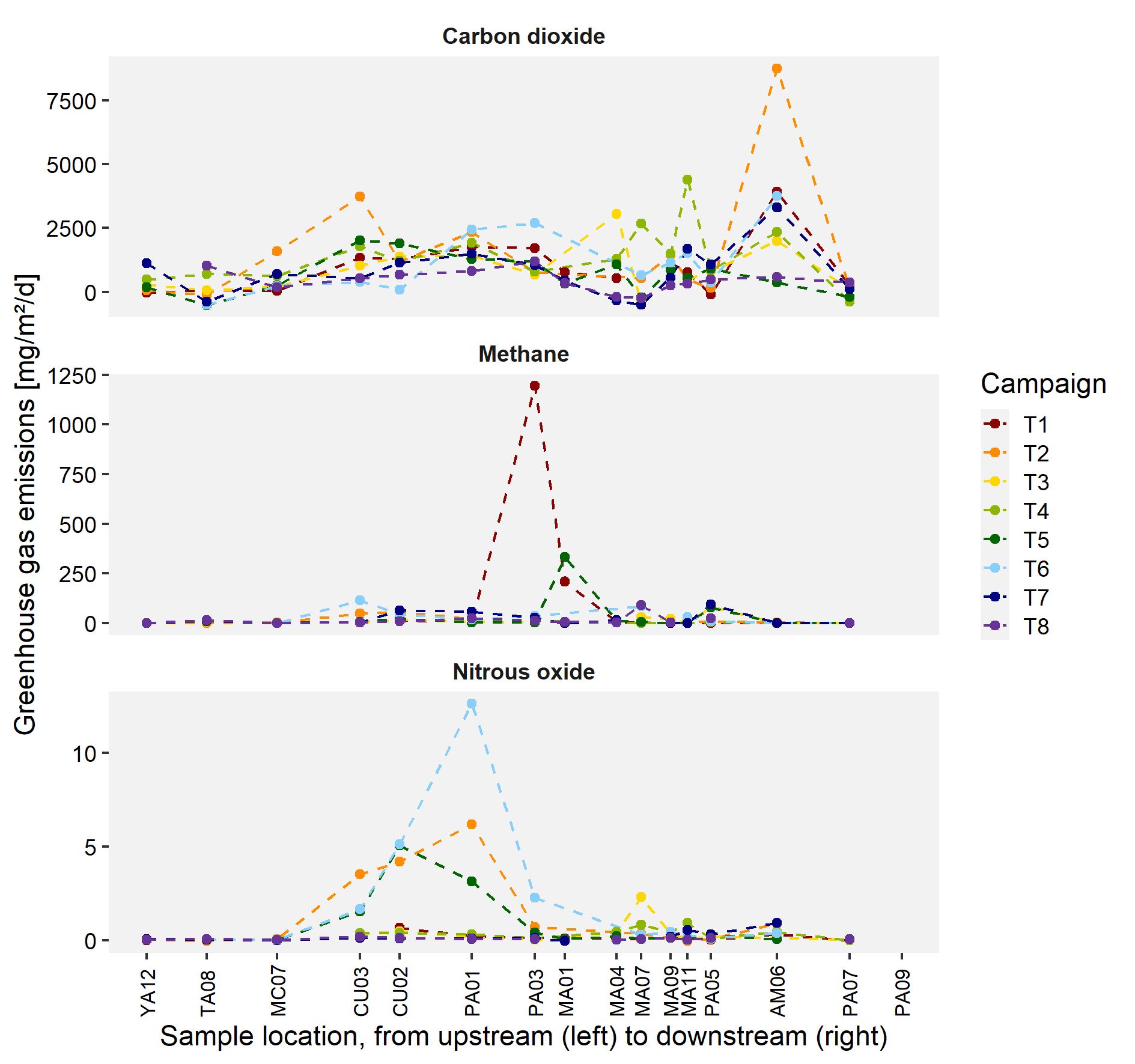 Aside from the temporal variability, we are also interested in the spatial variability and how greenhouse gas emissions change throughout the sampled river system. Via a subset of sampling locations, the spatial variability is displayed and shows an increase in carbon dioxide and nitrous oxide emissions downstream of the city of Cuenca during the drought campaigns (2 and 6), as well as in the upstream part of the Mazar reservoir (methane in MA01). Carbon dioxide emissions decrease slightly towards the downstream section of the Mazar reservoir, though seemingly increase again when present within the Amaluza reservoir. Over all, it can be said that nitrous oxide emissions increase due to the presence of the city of Cuenca, while also slightly increasing the emissions of carbon dioxide. Methane emissions seem to remain relatively stable throughout the system, though a single high value can mask more subtle changes.