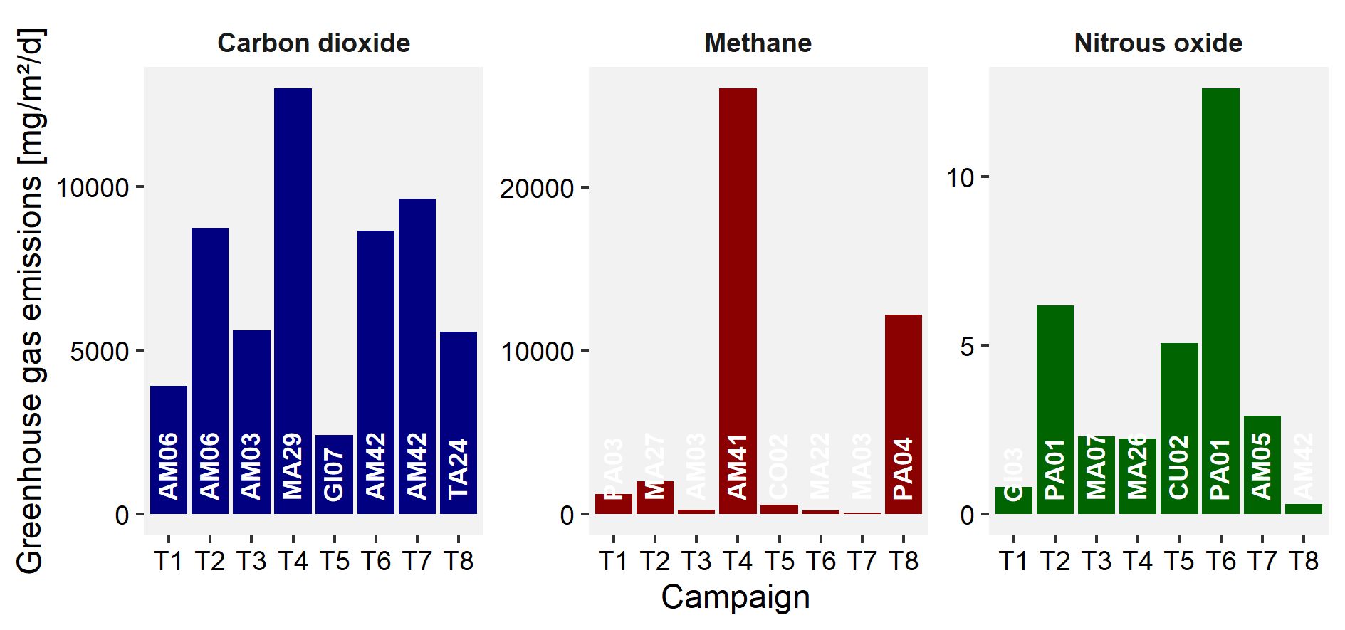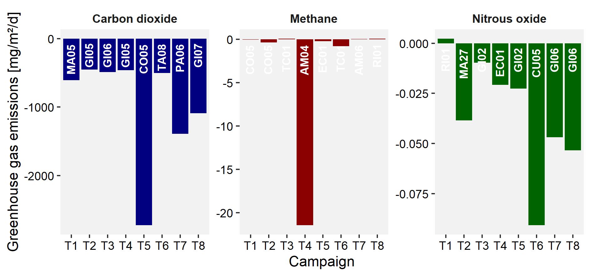 In contrast, nitrous oxide emissions showed to be highest in site PA01 during campaign 6, when an extreme drought was taking place. In addition, it is also remarkable that each of the considered gases can also be taken up instead of emitted to the atmosphere, as indicated by the (highly variable) negative values. When comparing these values, it is good to keep in mind that both sites AM03 and AM04 were heavily covered by water hyacinth whenever samples were collected.