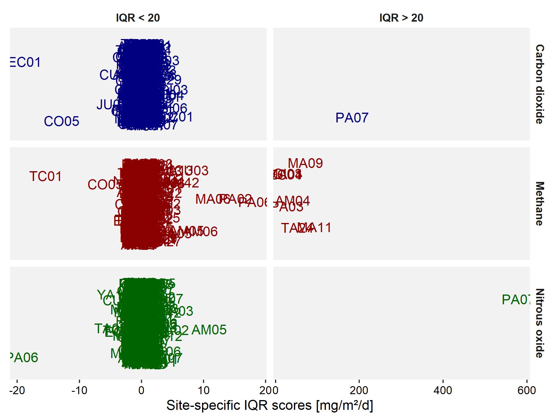 From the density plots, it can be observed that there might be some exceptionally high levels of emitted greenhouse gases present in our database. A deeper look into the presence of potential outliers can provide an answer to this. In order to be able to compare the analyses for all three greenhouse gases, a site-specific factor is calculated that represents the distance of a value from the median value in terms of the inter-quartile range (IQR). More specifically, a subset is derived from the main data set for each combination of sampling site and greenhouse gas, over all campaigns (hence, resulting in a subset of maximally 8 observations). Then, the median of this subset of greenhouse gas values is subtracted from the subset of individual greenhouse gas values, followed by a division by the IQR for the same subset of greenhouse gas values. The resulting distance factor directly gives an idea of how far each individual observation is removed from the sample- and gas-specific median value. For instance, a site with a distance factor of -2 is situated at twice the IQR from the median in the negative direction.