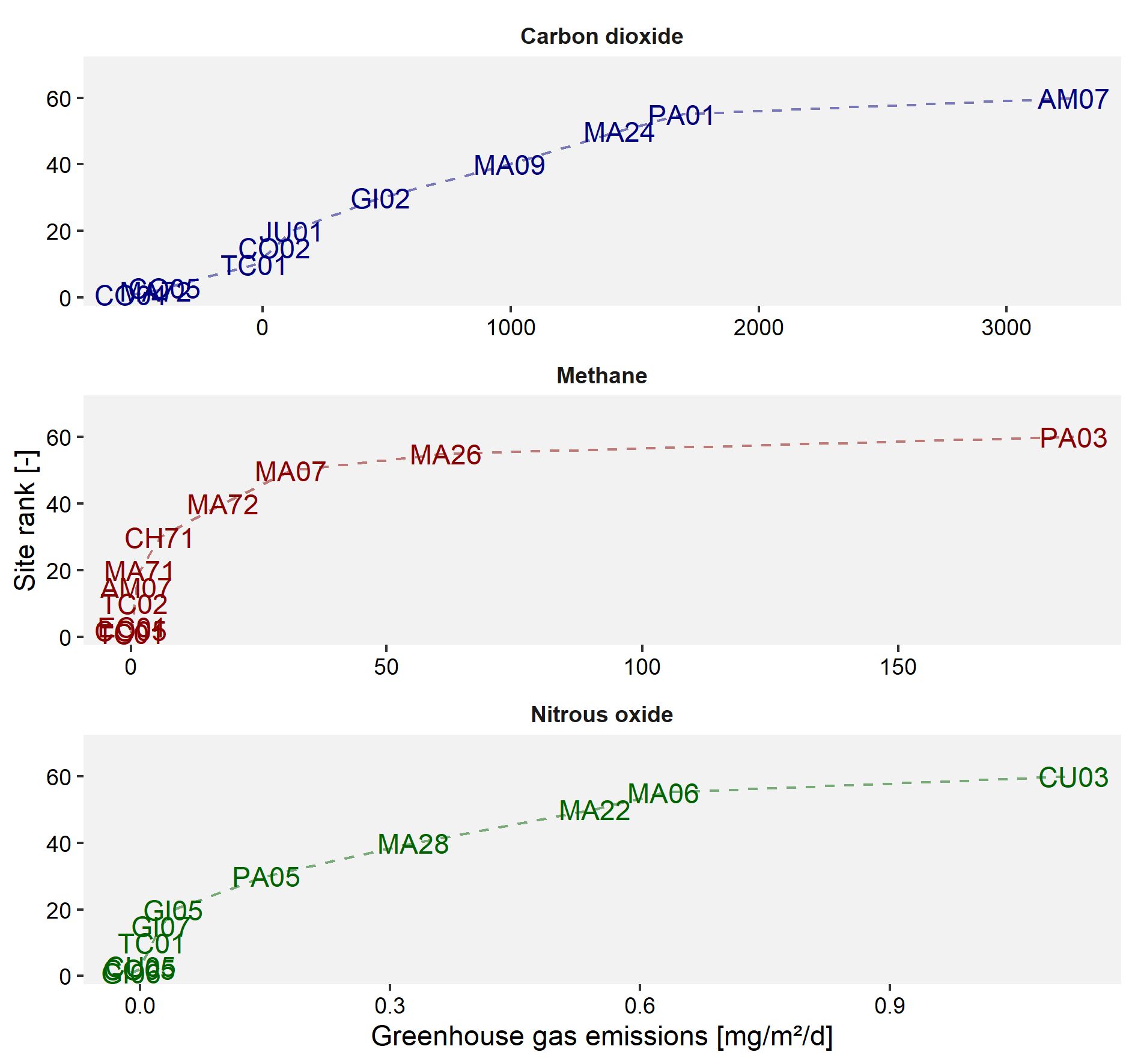Lastly, all available data is compiled into a single average level of emitted greenhouse gases per site to identify those sites that are, on average, the sites with the highest and lowest levels of greenhouse gas emissions. From this, it is clear that several sites stand out and that no single site is characterised by the highest emissions of two or three of the considered greenhouse gases. The site AM07 (close to the dam of the Amaluza reservoir) displays the highest carbon dioxide emissions, while PA03 (right before the start of the Mazar reservoir) has the highest methane emissions and site CU03 (directly downstream of the city of Cuenca) shows the highest nitrous oxide emissions. It is noticeable that several sites within the Mazar reservoir are characterised by having emissions that are higher than the average emission levels, whereas the Collay part of this reservoir (codes 'CO') can often be found at the complete opposite side. It should be noted that the depiction has been simplified by having only a subset of all sites, though the top and bottom three sites for each greenhouse gas are always included.