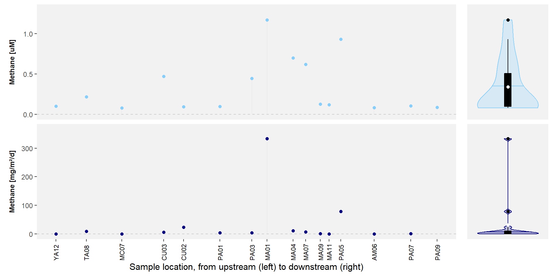 In addition to the more standard abiotic conditions, we also collected information on the presence and the emission of greenhouse gases in each of the 52 sampling sites. To get this data, we made use of a the headspace method (mixing 30 mL of water and 30 mL of air) and floating chambers (airtight containers sampled at fixed time intervals) on-site followed by the analysis of the obtained samples off-site. This data already resulted in some interesting patterns that are in line with previous campaigns. For instance, methane concentrations and emissions were the lowest in the upstream part of the Paute basin and highest in the Mazar reservoir (code 'MA'). Of special interest is the start of the reservoir (site MA01), displaying an excessive emission of methane and the highest dissolved level of the considered sites. This is a potential consequence of the introduction of carbon-based materials into the reservoir and the local upconcentration, though it also remains possible that this is a direct consequence of an ebullition event (sudden release of methane by the substrate, collected by the floating chamber).