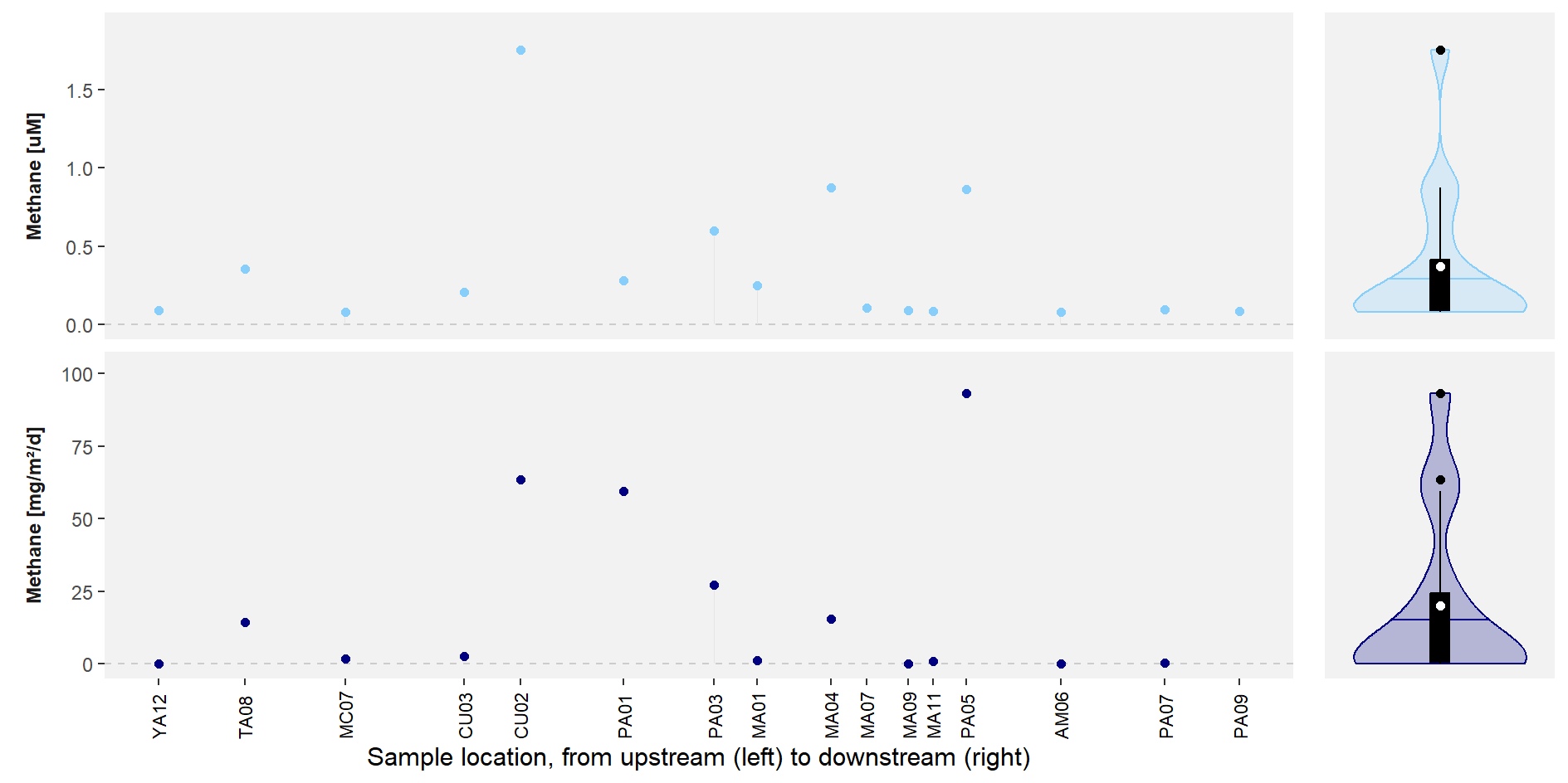 In addition to the more standard abiotic conditions, we also collected information on the presence and the emission of greenhouse gases in each of the 54 sampling sites. To get this data, we made use of a the headspace method (mixing 30 mL of water and 30 mL of air) and floating chambers (airtight containers sampled at fixed time intervals) on-site followed by the analysis of the obtained samples off-site. This data already resulted in some interesting patterns that are in line with previous campaigns. For instance, carbon dioxide concentrations and emissions were the lowest in the upstream part of the Paute basin and highest directly downstream of the city of Cuenca and the Mazar reservoir. The highest concentration was observed in location CU02, while the highest emission was observed in location PA05 (located downstream of the Mazar reservoir).