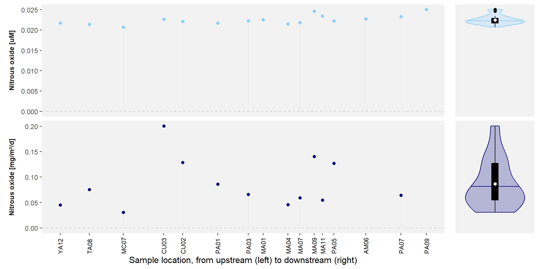 In addition to the more standard abiotic conditions, we also collected information on the presence and the emission of greenhouse gases in each of the 53 sampling sites. To get this data, we made use of a the headspace method (mixing 30 mL of water and 30 mL of air) and floating chambers (airtight containers sampled at fixed time intervals) on-site followed by the analysis of the obtained samples off-site. This data already resulted in some interesting observations that are in line with previous campaigns. For instance, nitrous oxide concentrations were relatively stable throughout the basin, while emissions were the lowest in the upstream part of the Paute basin and highest directly downstream of the city of Cuenca (site CU03).
